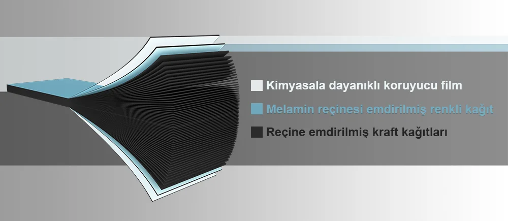 Laminat: İsteğe göre renklendirilmiş, (genellikle siyah) reçine emdirilmiş kraft kâğıtlarının ve üzerine dekor kağıdı ve koruyucu tabaka ile tek yüz kaplanması ile oluşur. Arka yüz, zımparalanmış bir başka yüzey ile kolayca yapıştırılacak şekilde hazırlanır. Çift yüzlü laminat üretimine ihtiyaç duyulmamaktadır. Standart kalınlıkları 0.60 ile 0.80 mm kalınlığında olup, ihtiyaca göre siparişle 1.5 mm ye kadar üretilebilir. Yaklaşık her 0.1 mm için 1 adet kraft kağıdı kullanılır. Buna göre, 0.60 mm için yaklaşık (kraftk kâğıdının kalınlığına göre değişmekle birlikte) 6 adet kraft kağıdı kullanılır.