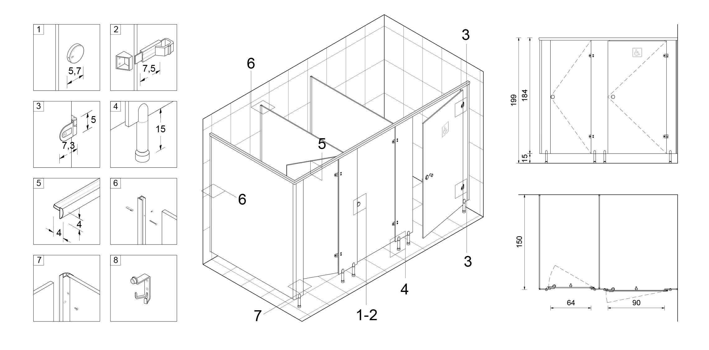 Kilit: Sürgülü, üzerindeki renkli mekanizma ile kapının meşgul olup olmadığını dışarıdan gösterir, mat eloksal alüminyumdur. Menteşe: Kapazlama (binili) kapı sistemleri için, kapıların kendiliğinden kapanmasını sağlayan, mat eloksal alüminyum, derece ayarlı ve güvenlik vidalıdır. Ayak: Mat eloksal alüminyum, 3 farklı noktadan anti-bakteriyel plastik zemin bağlantılıdır. Ayarlanabilir yükseklik 100-150 mm olup genel olarak ıslak hacimlere mevcut olan yerdeki eğime uyum sağlamaya yardımcı olur. Profil ve Bağlantı Elemanları: Başlık profili 52*52mm, parlak eloksal alüminyumdur. Toz tutmayı önleyen özel oval tasarımı hijyenik ortam sağlar. 18*25mm boyutlarında olan “U”, kapı bini ve köşe profilleri panel-duvar ve panel-panel kesişim noktalarında kullanılır. Aksesuar ve kabin montajında kullanılan tüm bağlantı elemanları 304 kalite paslanmaz çeliktir. Köşe Detayı: Kompakt laminatın açıkta kalan dik kenarlarına güvenlik ve pürüzsüz siyah rengi sağlamak için radius bıçağından geçirilerek oval form verilmektedir.