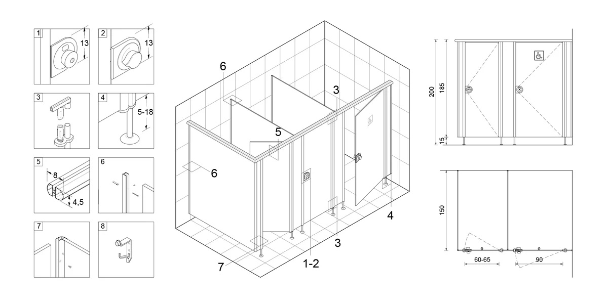 Jumbo modelinde alüminyum profiller yuvarlak kesitli ve iç içe geçen yapıdadır; kinişli başlık kompakt laminatı iki taraftan hapsederek çok sağlam bağlantı sağlar ve kapı alttan üstten menteşe tarafındaki profile bağlanan mil menteşelerle çalışır; kilit tok bir kullanım hissi verecek şekilde içten çevirmeli dıştan tutamaklıdır; ayaklar kapı yan profillerinin içine geçerek bağlanır ve bu detay hem orta panonun daha sağlam olmasına hem de kompakt laminattaki dönmeleri kontrol etmeye katkı sağlar; model, görünümü ve detayıyla exclusive/pahalı bir ürün karakteri taşır.