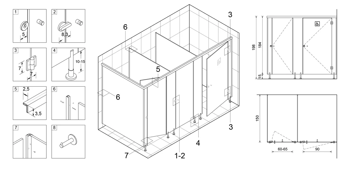 Regal WC Kabin Kabin yüksekliği: 2000-1900 mm Regal WC Kabin Panel yüksekliği: 1830 mm Regal WC Kabin Ayak yüksekliği: 200-50 mm